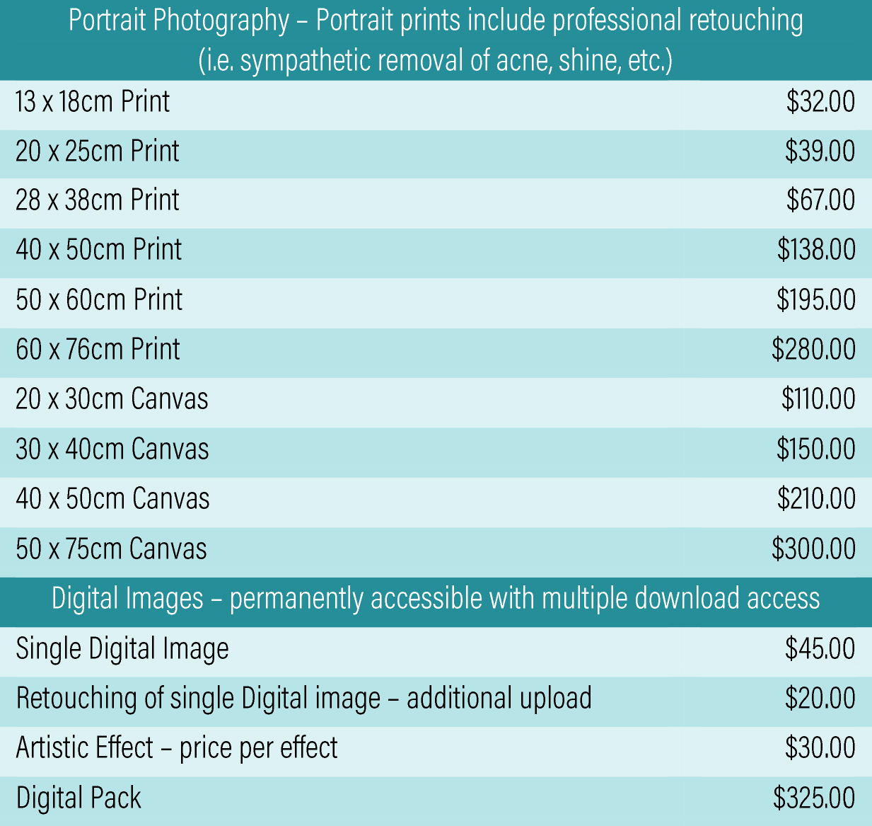 To view our photography price list please click here. All prices are quoted in Australian Dollars (AUD).